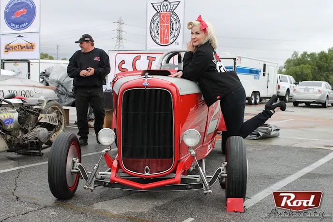 Aside from snapping a shot of this lovely winter pinup hanging next to this roadster in the SCTA display, a couple of the SCTA fellas gave us the lowdown on the 2014 El Mirage racing schedule. Check it out below.