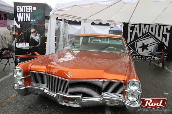 The folks at Famous had setup a booth at this year’s Mooneyes Xmas Party to show off Travis Barker’s ’65 Coupe DeVille which was being raffled off as part of a holiday giveaway contest.