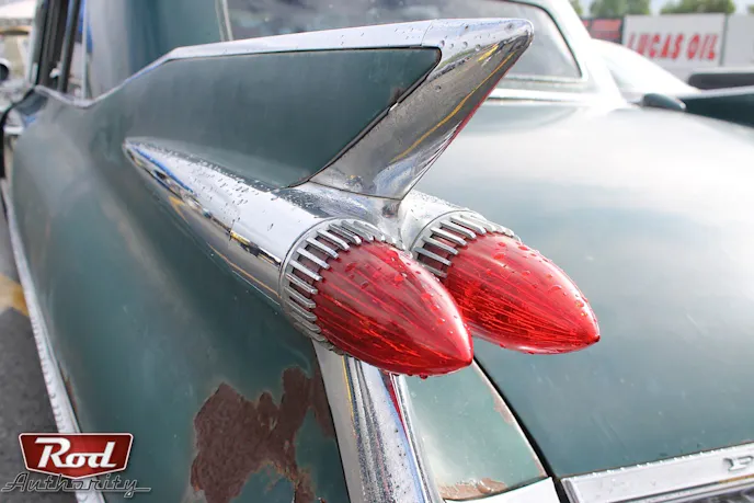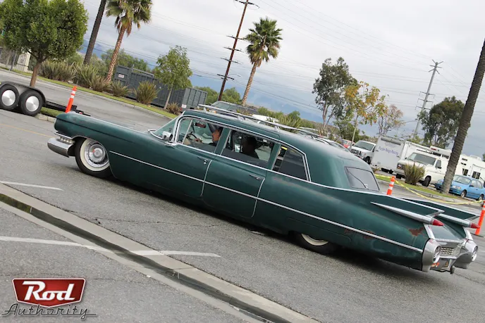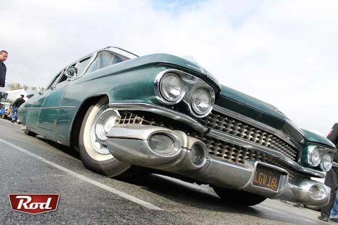 The ’59 spans an overall length of 20 feet and comfortably fits up to nine passengers. It sports the iconic set of tailfins introduced by Cadillac in 1948 and the one we caught at Mooneyes gracefully cut through the air as it was cruising the Irwindale Speedway lot. The quad headlights, wraparound egg crate grille up front, matching egg crate in the rear, and dual bullet taillights round out this steel titan. It was a definite treat and site to behold.