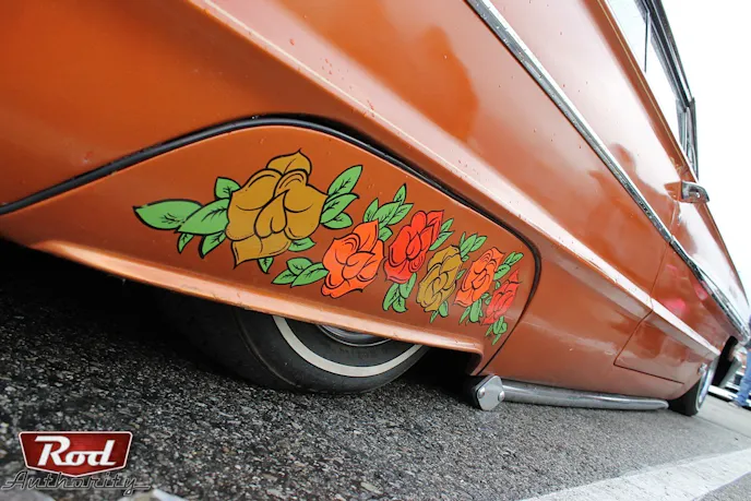 The description continues, “Exhaust comes from dual 18-inch cherry bombs or un-corked lake pipes. CH Topping in Long Beach applied the disc brakes and the car sits with a custom airbag setup fitting around Astro Supremes with white walls.”