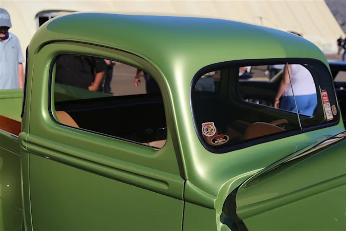 The truck has a 1 1/2-inch chop, custom back glass, custom front and rear bumpers, custom rear roll pan, grille, and a pancaked hood. “There’s so much to tell you about, but the thing I wanted the most in this truck was a Coyote engine,” Robert said.