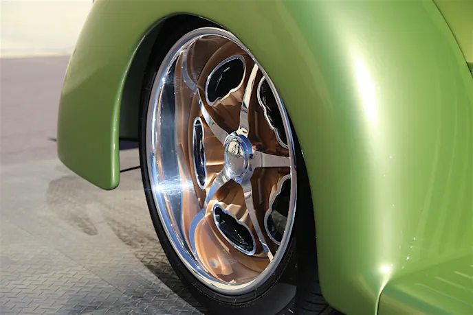 Rolling back on what Robert mentioned earlier, the glorious truck houses a Ford Coyote 5.0-liter V8 engine, complete with an intake and custom valve cover. The truck spins on a set of Schott Octane wheels, which were painted bronze with polished centers and spokes, all wrapped in Pirelli rubber.