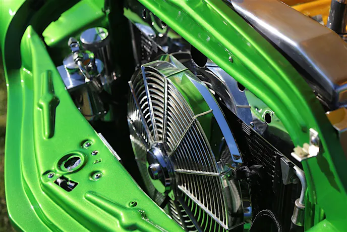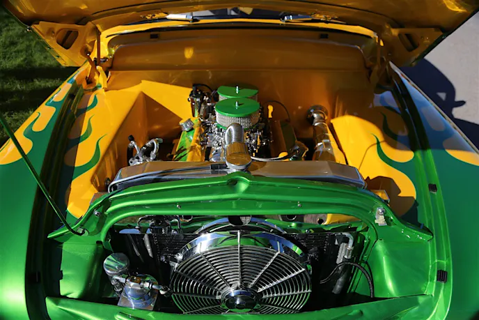 Furthermore, the engine is mated to a Turbo Hydramatic 350 automatic transmission and custom spindle stainless steel A-arms, and a custom Ridetech air suspension system. “The top has been chopped three inches, all of the moldings have been removed and smoothed,” Neve said. “The door handles are shaved and the front rear bumpers have been molded.”