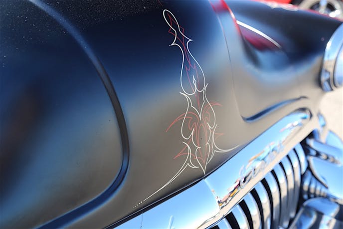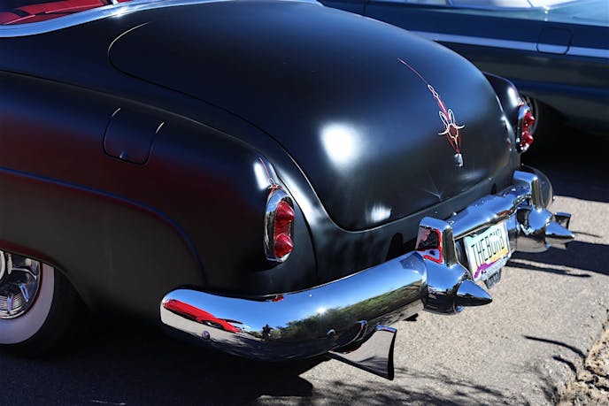 Furthermore, the engine is mated to a Turbo Hydramatic 350 automatic transmission and custom spindle stainless steel A-arms, and a custom Ridetech air suspension system. “The top has been chopped three inches, all of the moldings have been removed and smoothed,” Neve said. “The door handles are shaved and the front rear bumpers have been molded.”