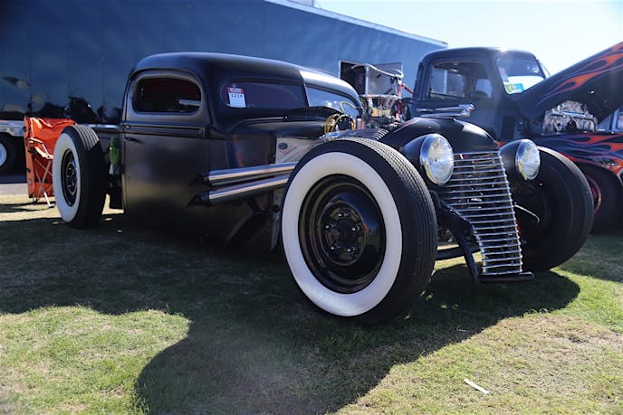 Talking power numbers, it is powered by an exposed Chevy 350 cubic-inch V8, mated with a Turbo-Hydramatic 350 automatic transmission to help put down power. Custom fabricated pipes shoot out the sides thanks to a Speedway Motors kit. The wedge chopped top, matte black paint, and intricate pinstriping on the back of the cab and trunk lid add a nice custom touch. The black steelies are wrapped with whitewall Firestone tires, giving the truck an aggressive touch.