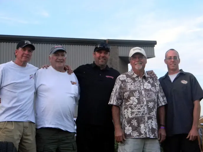 From left to right: Roy Brizio, Andy Brizio, Marc Meadors, Gary Meadors and Eric Peratt pose for a group shot in front of Pinkee's Rod Shop.