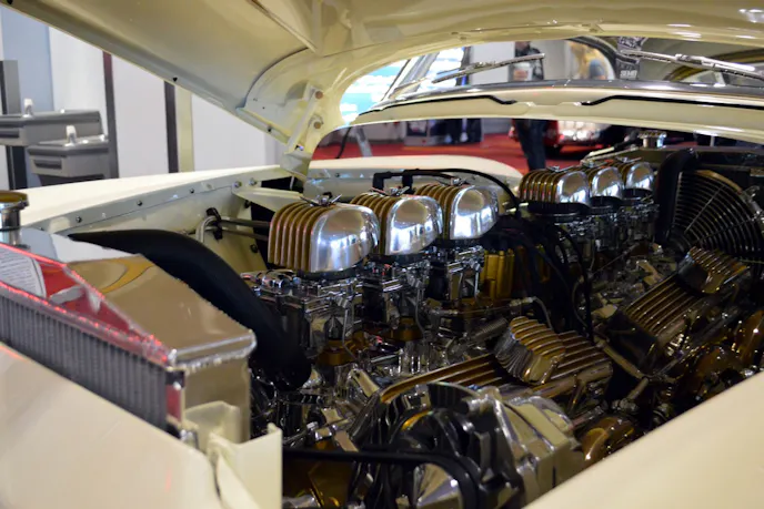 Powering the car is a Chevy 283 ci Tri-Power engine with stainless RAM Horn headers, a polished Be Cool aluminum radiator, custom finned valve covers, carburetor and intake covers.