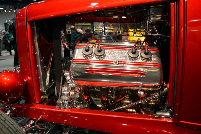 Powered by a Rose Motorsports-built 296 ci V8 engine, the 60s-style drag/show roadster is fitted with the best in high performance components, including a Blower Shop 671 billet blower, Tremec five-speed manual transmission and a Halibrand Quick Change rearend. Other notable features of the car include Candy Apple Red paint with gold leaf details and a custom interior, complete with a red Plexiglas dash, and Stewart Warner gauges.