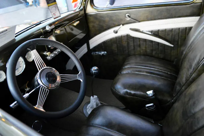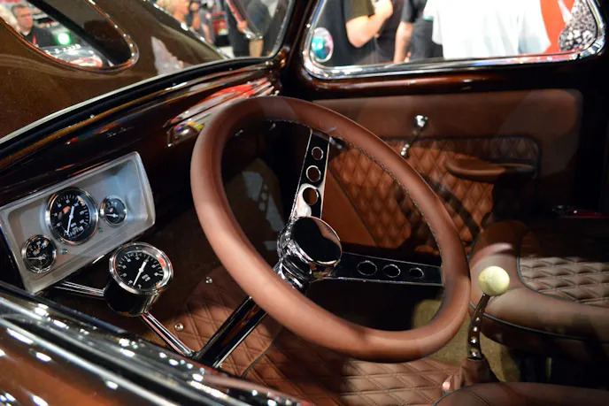 With body work done by Cypress Auto Body and fabrication taken care of by Rick Kirsh and Gregg Petersen of CSS, the Willys maintains its classic body lines with a few finishing touches under a custom PPG paint scheme. Inside, the car is just as gorgeous thanks to a custom interior from Westminster Auto Upholstery, featuring Kotto glass and Classic Instruments gauges.