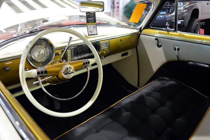 While the body of the truck features many factory design cues, which are preserved from R.C. DeFoor’s collecting days, it also features many unique components, like custom front and rear bumpers, a custom electric bed cover, Curly Maple truck bed, and frenched headlights. The fine restoration work and body modifications are set off by a custom Wandabase mix, with the top half of the truck painted in titanium and the bottom half painted in Copper Blaze.