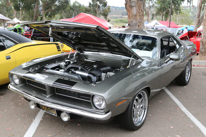 Decorated with race livery atop the repainted, original Soft Yellow, this Barracuda was all business. At first, it was the no-frills approach to toughness that made it stand out, but the closer we looked, we realized this car has really been turned into a brutish ground pounder. Originally a Slant-Six car, it is now powered by a 408ci Magnum mated to a 727 TorqueFlite trans with a Gear Vendors overdrive. After we climbed under the rear of the car, we noted the leaf springs were missing. Instead, a triangulated 4-link with coilovers was in charge of keeping the ride tight through corners. This Barracuda has been stiffened, straightened, smoothed and massaged into the very capable street machine you see now.