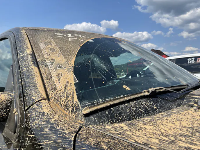 The Street Muscle team tore themselves away from all the Mopar muscle long enough to scope out the dirty festivities and snap a few flicks of that vehicule damage. We’re not late-model truck experts, but we think it’s safe to say, the new TRX is not supposed to look like this. Unfortunately, an airborne TRX pilot found the limitations of their truck’s airbag system upon impact during a quick launch on the short course. In fact, the explosive nature of the airbag exerted enough force to not only blow out the steering wheel and dash pads, but send spiderweb cracks across the entire windshield as well.