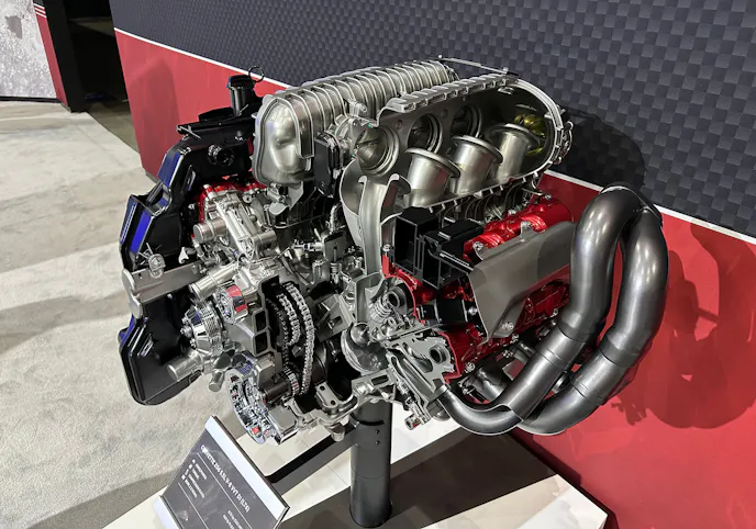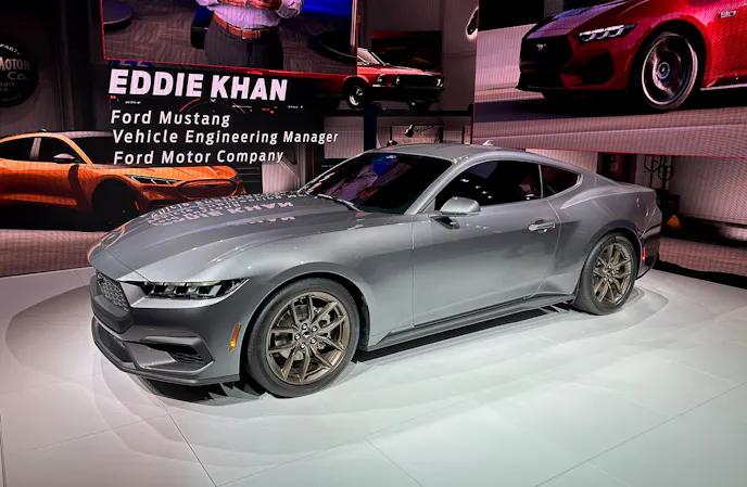 Beginning at the low end, there was a Graphite Gray Metallic Mustang coupe packing the 2.3-liter EcoBoost turbocharged inline-four powerplant. Word at the show was that this lump, which currently supplies 310 ponies and 350 lb-ft of torque, will receive some massaging for extra power in its 2024 configuration.