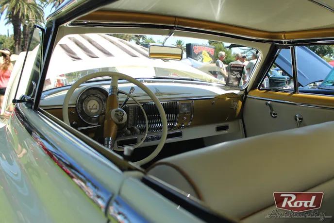 On the inside, gold piping and cream seats keep the whole build in line. The dashboard was extended downward to house a modern AC/heating unit that looks like it was designed in the 50s. There’s nothing out of time about Jerry’s kustom and it’s always a pleasure seeing traditional rides like this at Goodguys.
