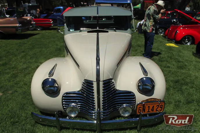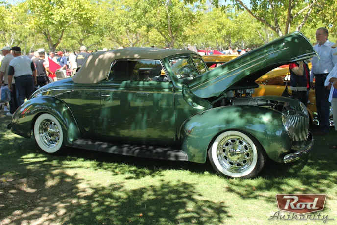 Chris’s ’40 was one of the first rides that caught our eyes at the show. Sitting atop a grassy knoll it oozed West Coast soul. From that slick look that only quarter skirts fully covering the rear tires can impart, rocker panels hugging the ground, to the the split visor and classic two-tone color scheme. Chris’s ’40 nails, to us, the definition of a traditional resto-mod–a majority of parts and accessories are kept true to the make, model, and era while it boasts a few modifications short of it being considered a mild-custom.