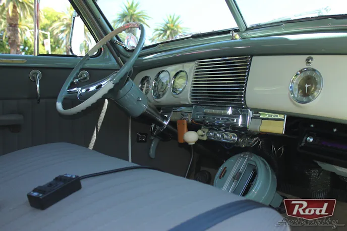 The 350 ci/TH350 powered ’50 houses the powerplant inside of a beautiful bay–not as pretentious as a shaved and smoothed Ridler bay, but tidy, consistent, and with some real soul. The kind of soul from a driver that knows a thing or two about living fast, but looking presentable. The mirrored firewall and matching gold/chrome finned beauty kit tie everything together.