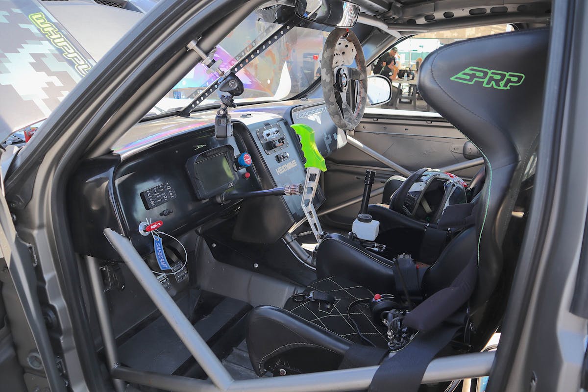 If your’e wondering why Brad’s truck looks a little smaller than your average Silverado, Brad told us “We built this whole truck on our show, Twin Turbos. From the frame up, everything you see on this, we built. In fact, this thing is way shorter than a regular single-cab Silverado. We shortened the wheelbase by using a crew-cab style bed. We built it to Formula Drift spec – the only difference is my truck is about 3-inches longer than any Formula Drift car, but it still retains 74-degrees of steering angle.”