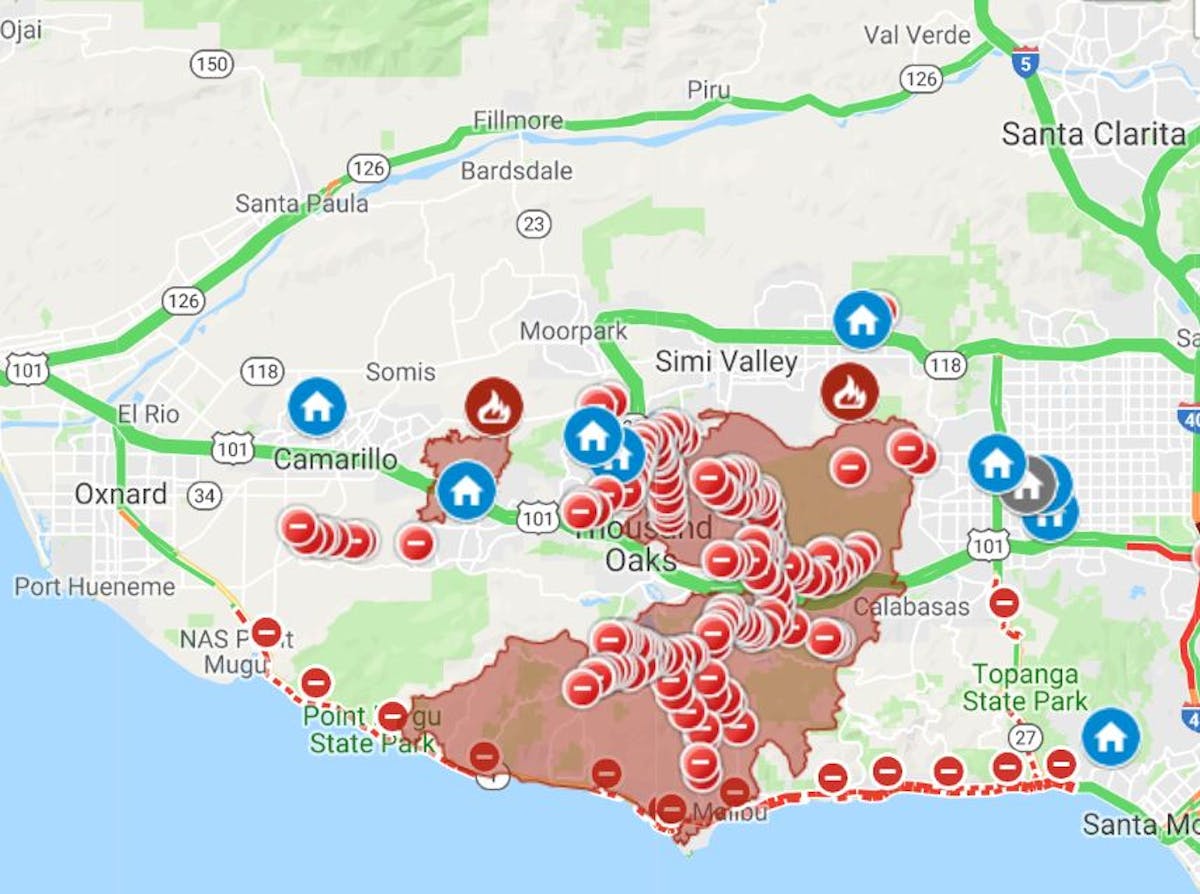 For reference, in the map below, I was stopped on the 101 between between Calabasas and Thousand Oaks on Thursday afternoon. A few days later, it had jumped the 101 and went south to the ocean. The route Google took me to get Pacific Highway is now destroyed.