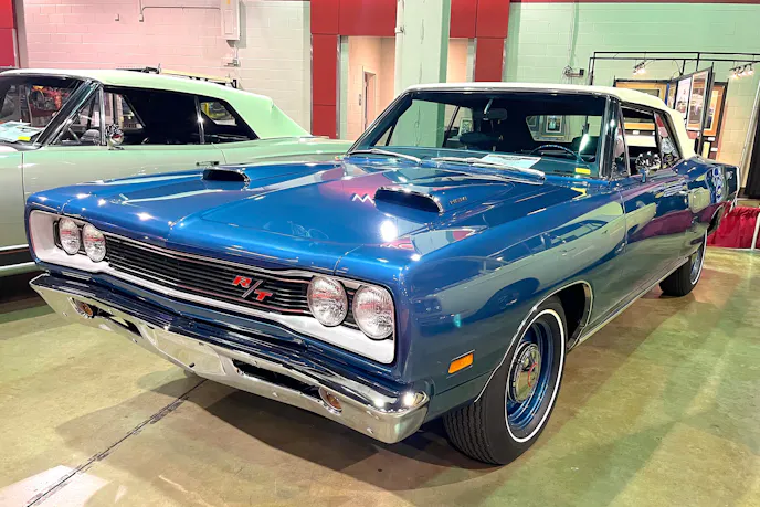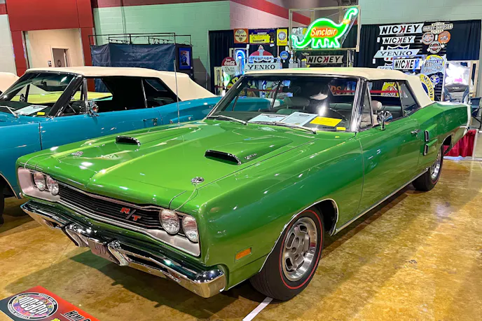 1969 Dodge Hemi Coronet R/T — Emblazoned in Rallye Green, a midyear color option for Dodge and Plymouth intermediates, this 1969 R/T, with its white top and interior, along with the rare Kelsey-Hayes “Recall” wheels, stands out among the other Hemi ragtops. The Ramcharger hood and quarter-panel scoops gave it a “Mean Green Machine” vibe.