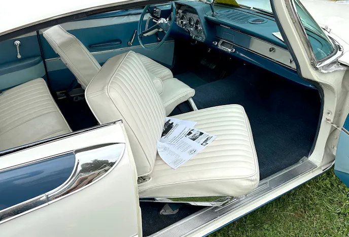 Sporting a 326 cubic-inch V8 mated to a pushbutton TorqueFlite transmission, the car was equipped with some nice options, including the roulette-wheel hubcaps. Patrick was thoughtful enough to display the car with the passenger door open so the rotating, easy access seat could be viewed. A very nice car.