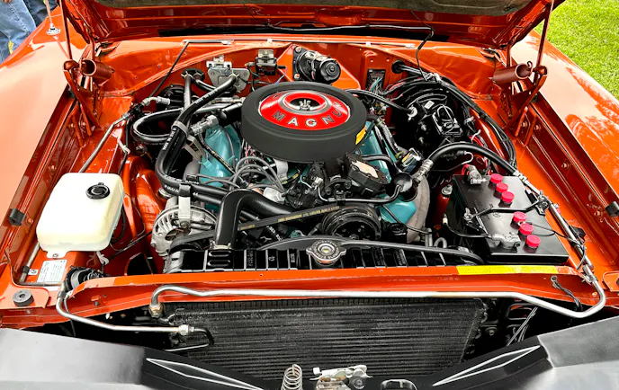 Painted as such, Scott’s car truly dazzled, especially against its contrasting black vinyl roof and twin “Bumble Bee” stipes across the rear. Under the hood gleamed its enormous 440 Magnum V8 with not a smidge of dirt or grime on it.