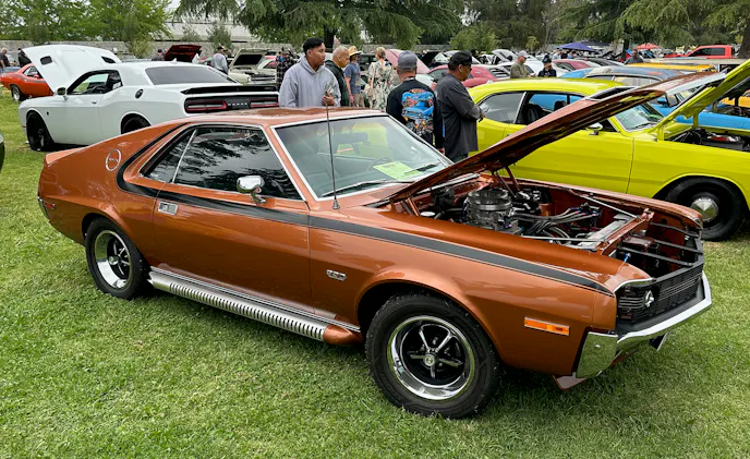 Representing the little car company that could in a fine manner was a 1970 AMX owned by Mike Batanero. Mike’s car was very unusual in that was painted in P79 Bittersweet Orange, a rare color more similar to copper than orange, with black C-stripes over a black interior.