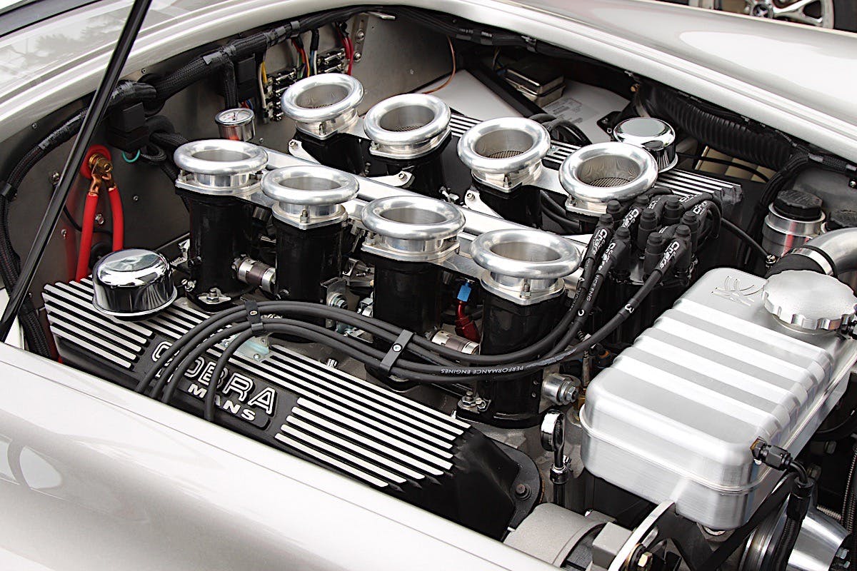 Rob’s attention was later summoned to explain one of the highlights of the show, the Factory Five Mk4 Roadster that FFR head honcho Dave Smith pulled from his own personal collection to showcase an Edelbrock Coyote crate engine. Dave said it was time to up the ante for today’s hobbyist, 700 horsepower was yesterday, so the 800 horsepower blown Edelbrock crate engine was the perfect choice for this build, all done up in Edelbrock red.