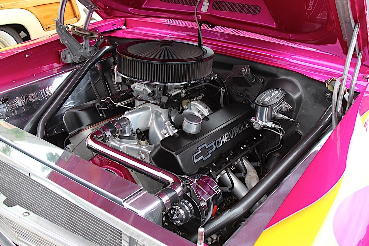 We loved the skull detail on the front – a sort of apocalyptic scene of survival, we checked closely, but none of the skulls seem to resemble Mr. Nader. We looked the car over and there were a few pretty cool touches, but the bottom line is that you just can’t go wrong when you stab a V8 mill into the back seat area of a Corvair.