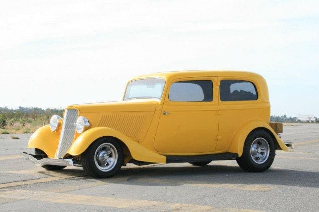 The car rides on a dropped axle front end with leaf springs and four-link rear that utilizes coilovers. Propulsion is provided by a small-block Chevy displacing 383 cubic inches. Exhaust notes come via California Street Rod headers and Borla exhaust. Shifting gears is another old school favorite, the 350 turbo transmission. Backing it all up is a Currie Enterprises 9-inch rearend. Stopping is handled by disc brakes on the front and drums at the rear.