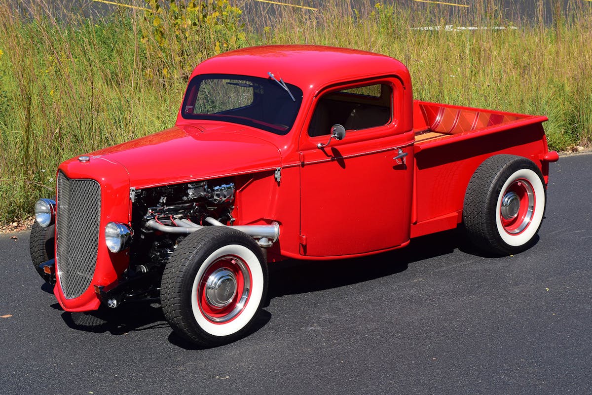 The hot rod’s all-steel body has the roof chopped nearly 3 inches. The custom bed was handmade using oak with stainless steel. The chassis comes from a 1988 Mitsubishi Mighty Max two-wheel drive pickup. The frame remains stock-width and is modified very little to accommodate the cab, bed, and drivetrain.