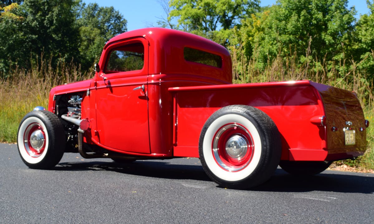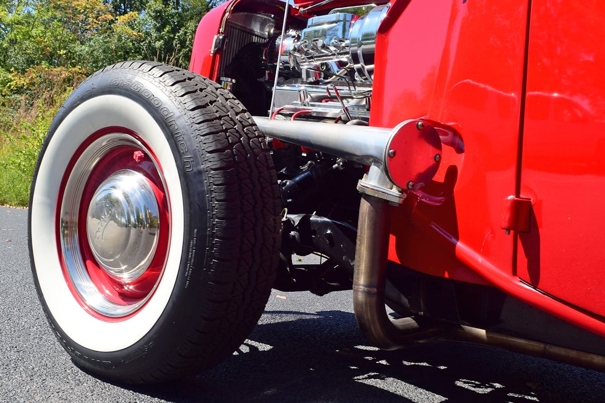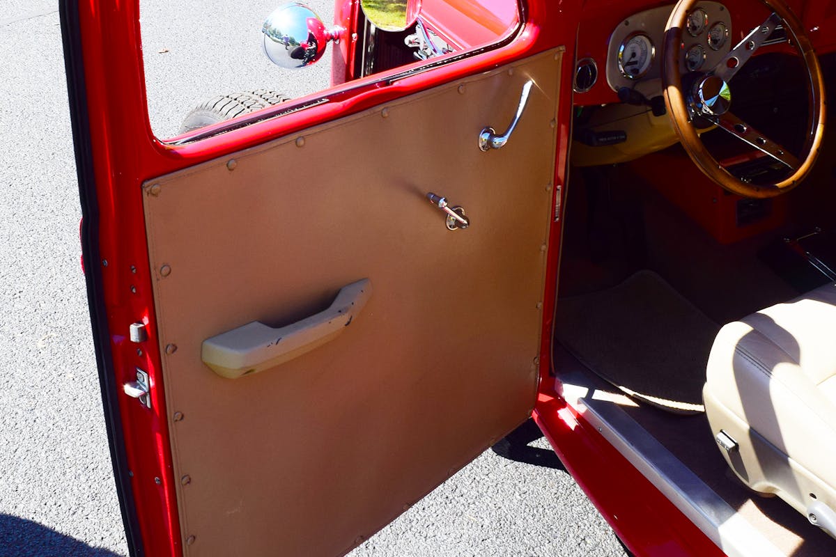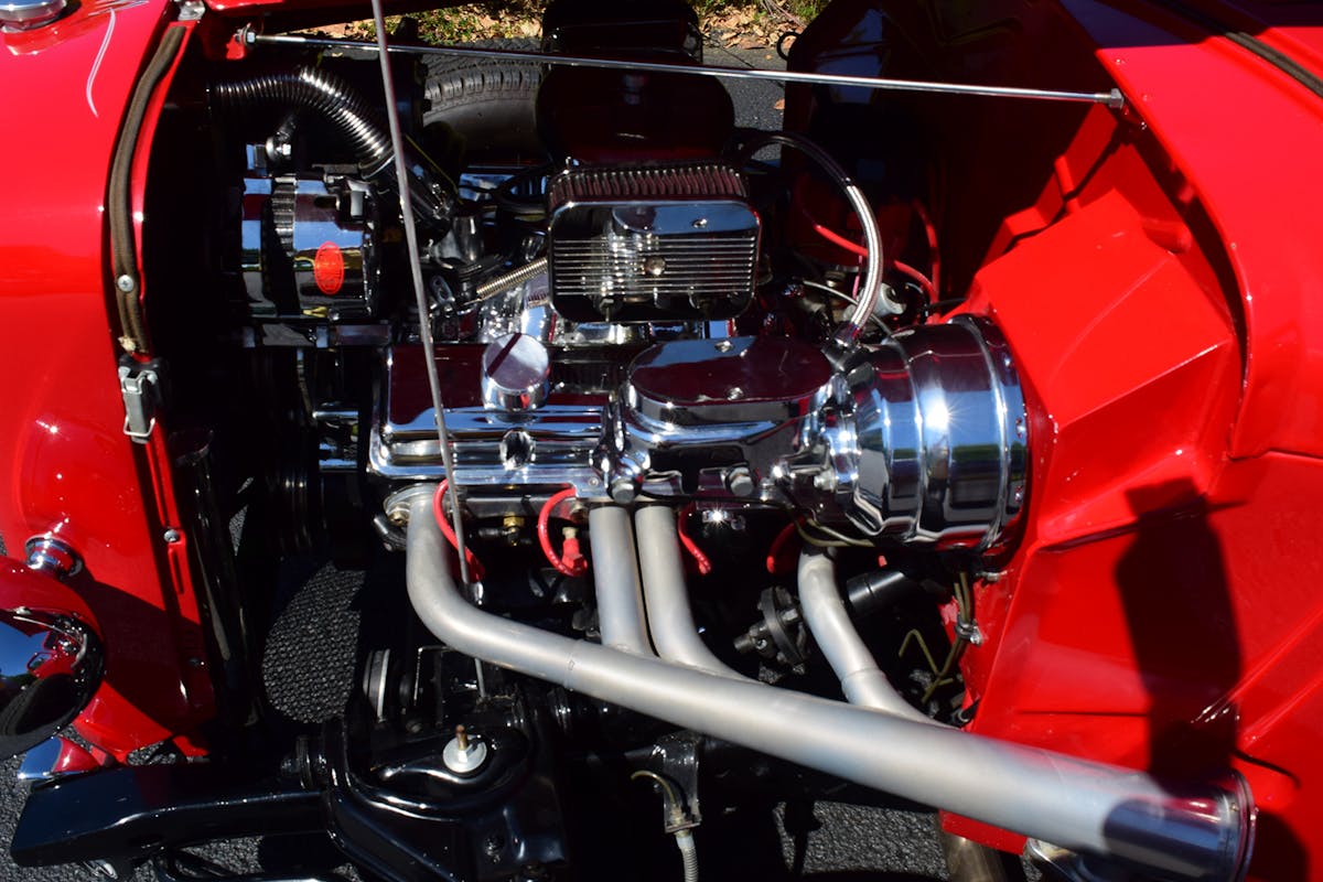 All the paintwork and pinstriping was done by Jeremy Hooker of Hooker Hot Rods in Damiansville, Illinois. The paint is Victory Red basecoat and clearcoat. “I’m a big fan of Jeremy’s work,” Robert says. “I took it to a show and told him to do what he wanted with it. I said be creative, go crazy with it, and let me know what I owe you for it. He did a great job and I trusted him to make it look good. I also had him pinstripe the hubcaps with the Ford logo on it.”