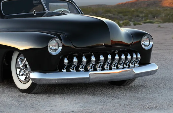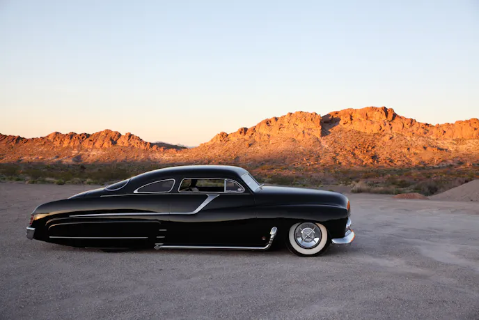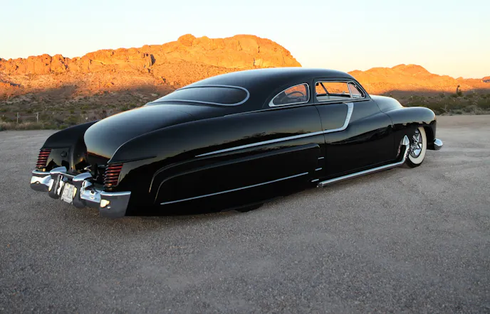 “The goal was long, low, and sexy,” Rick explained, “The roof would have to be chopped 4 inches in the front and 4 1/2 inches in the back, the body channeled and stretched a full 8 inches, then bagged, nosed, and decked. I had to find ’51 Merc sheet metal for the side panels. To get the right look, we handcrafted lake pipes with cut outs. I wanted stainless accents from a ’58 Olds and a ’55 Pontiac. The skirts were handcrafted to fit, and we shaved the door handles and installed remote poppers.”