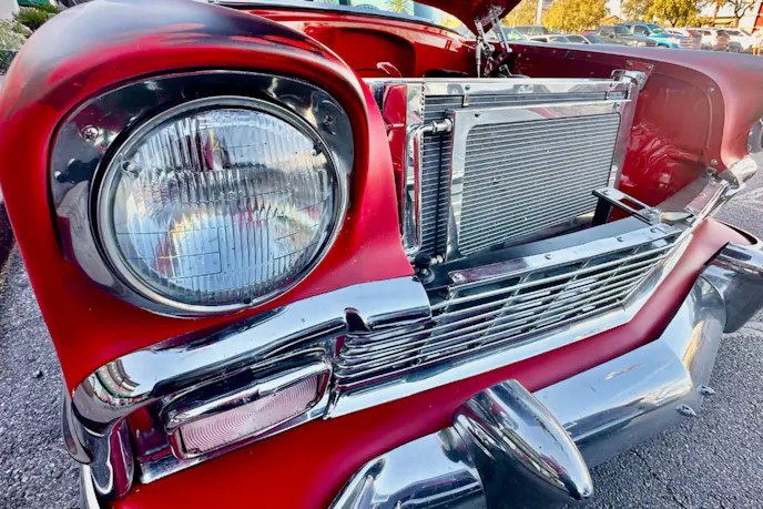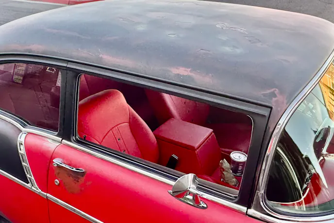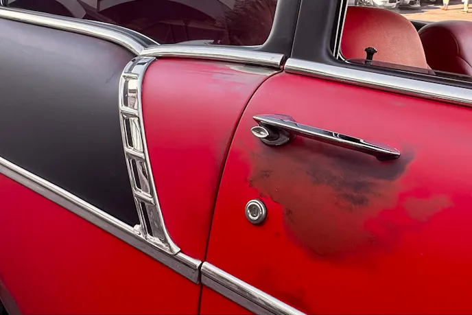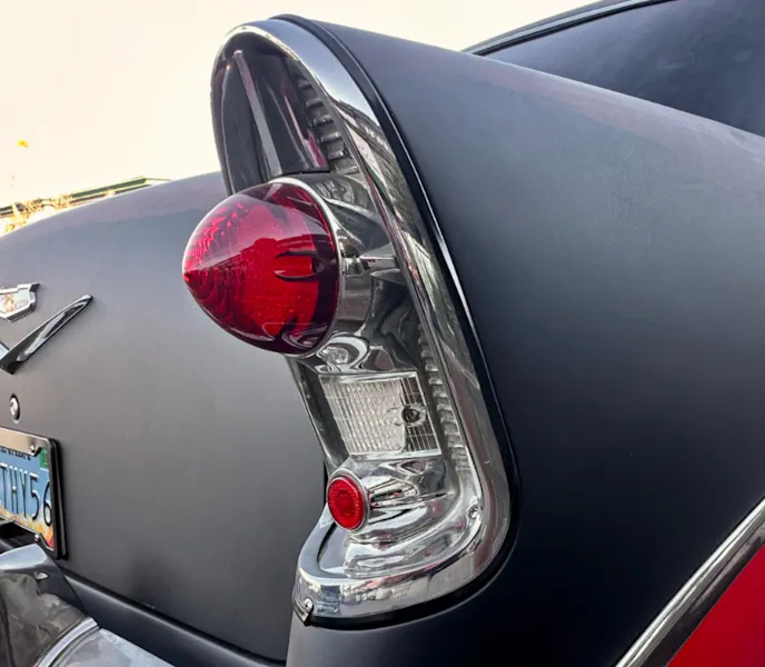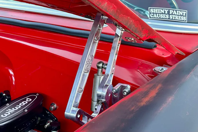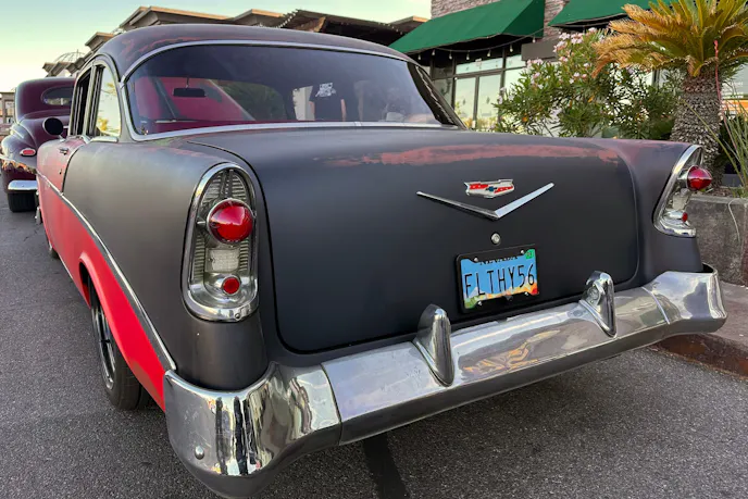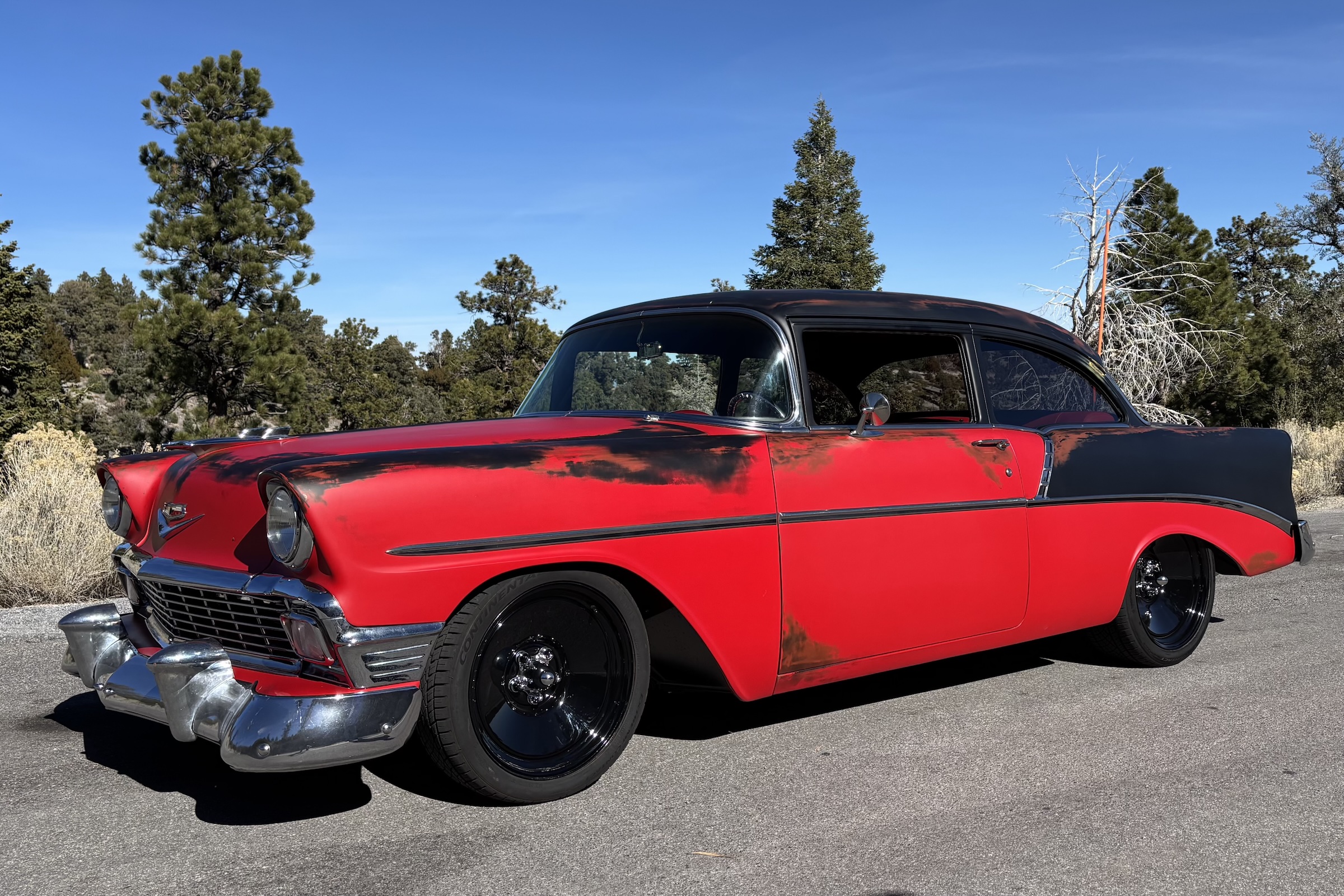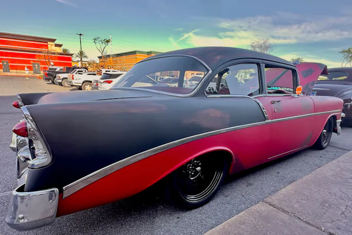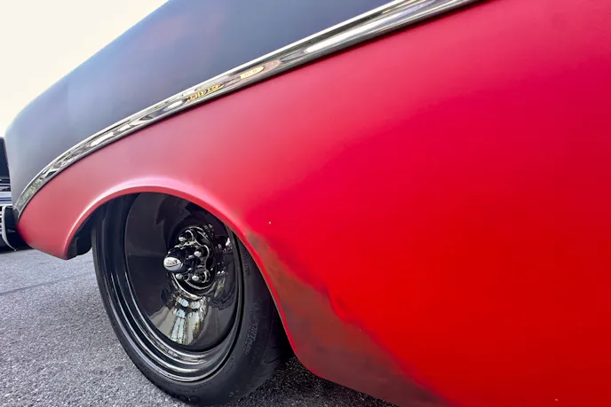 The ’56 Chevy’s red and black tuxedo was intact when Mike picked it up. Leaning into the OG vibe, he decided to pass on an ice cream paint job. It was his first venture into patina, and he was all-in on the idea. He estimated he used five different colors blended for the look and a matte clear to finish it.