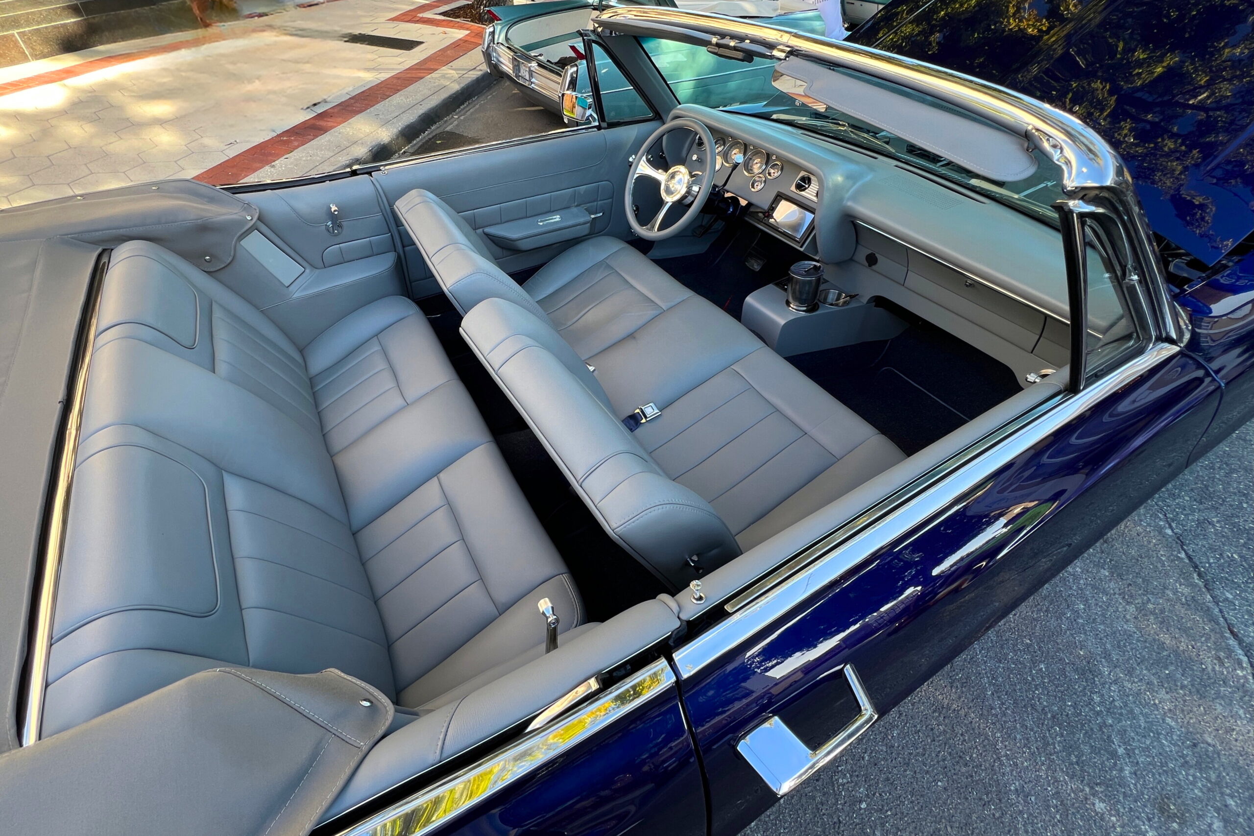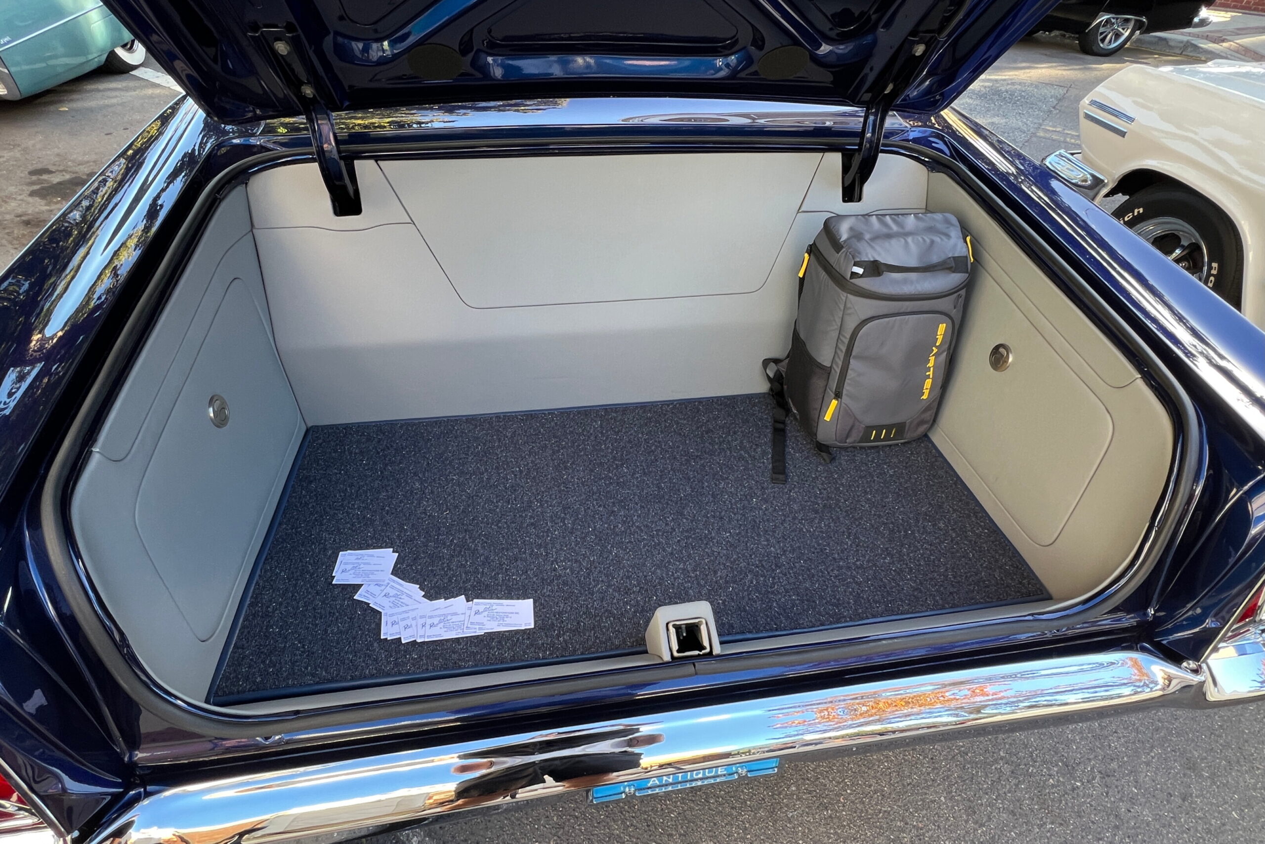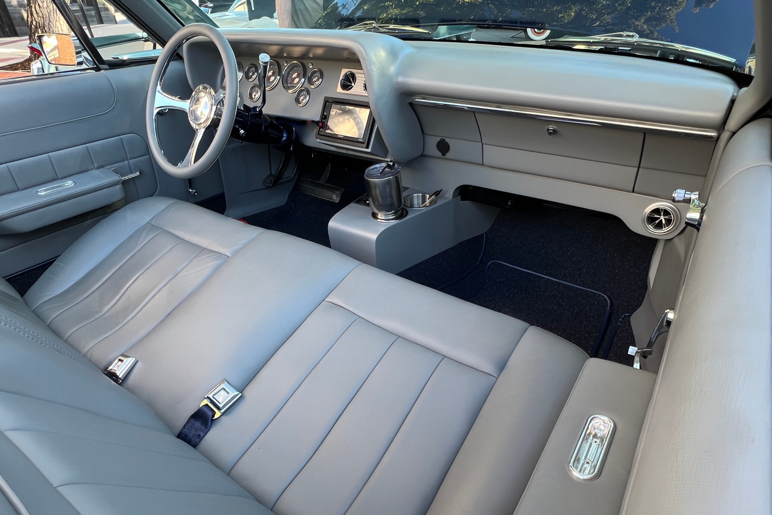 Inside, precious little was left stock. The bench seats were encased in sumptuous Garrett leather and custom embossed leather inserts were made for the door panels. The factory horizontal speedometer and gauges were pitched for round dials that communicate with the factory electronics. Restomod Air keeps the passengers comfortable. It has a Sony head unit in a high-end Focal system (bluetooth capable) with hidden 10-inch speakers in the rear. There’s even a back-up camera, which is definitely helpful when that rich convertible top is up. One unusual feature is has crank windows inside because the owner wanted to retain some of the old-car attributes.