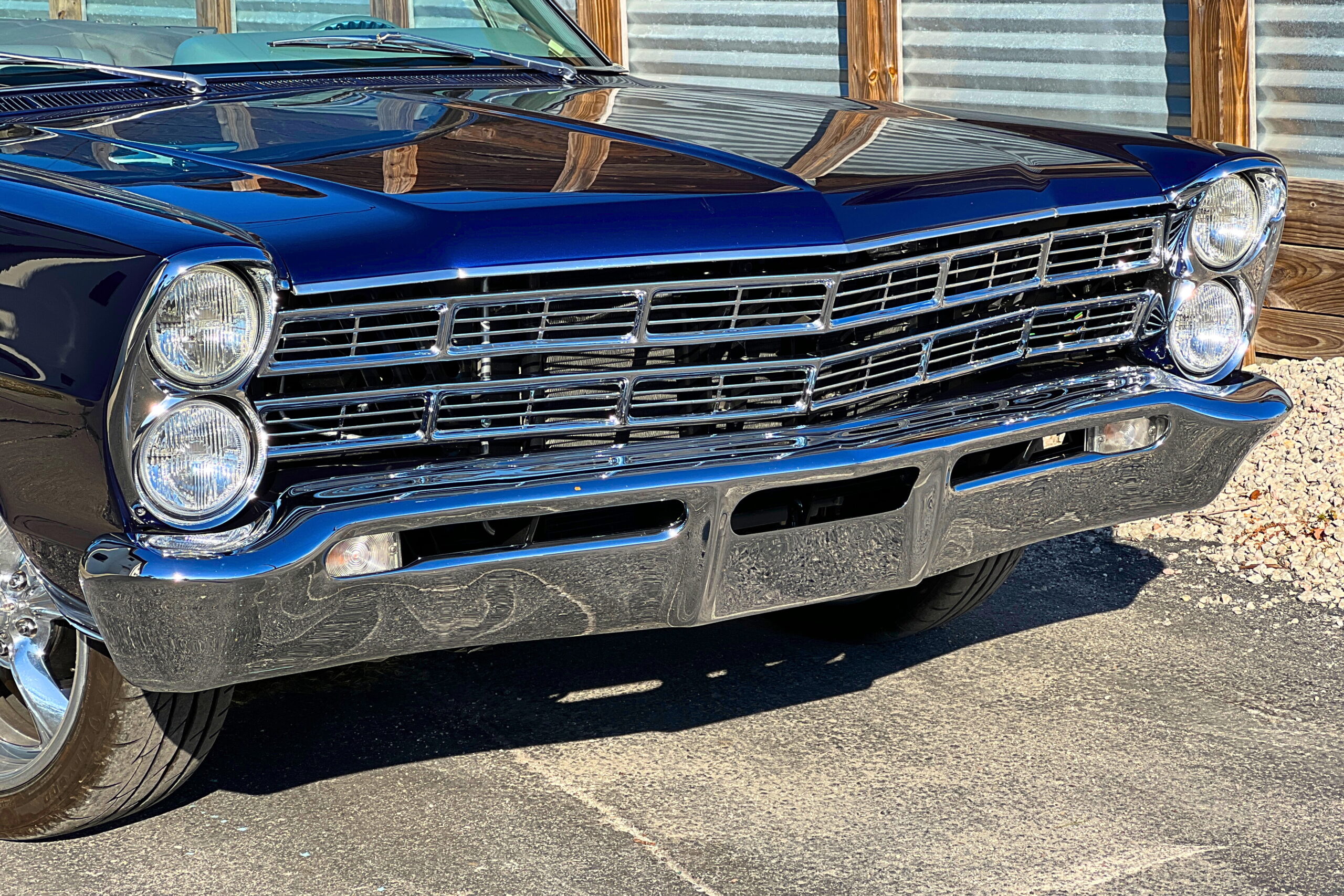 Most of the factory trim was removed to clean up the exterior. Only the Galaxie 500 nomenclature on the rear fenders was retained. The stock grille was chrome plated for extra pop and it really stands out with the deep, dark Kona Blue paint. In fact, all the chrome was redone. The bumpers were shaved and all the hardware is hidden