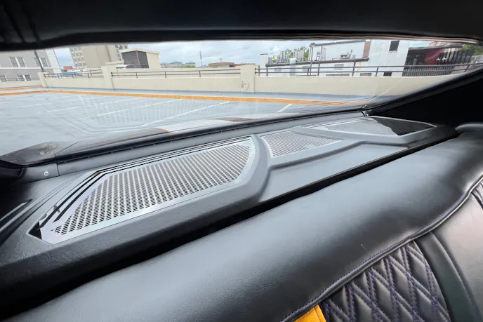 A set of gorgeous Forgeline RB3C Concave wheels in satin black hold the sticky Continental Extreme Contact Sport summer tires. The rims measure 18×12 front and 18×9.5 rear, while the tires check in at 335/30 out back and 275/35 up front.