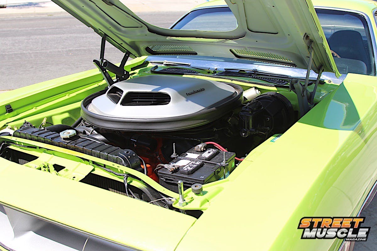 When Marty first picked up the Cuda, it was not wearing the colors it wore when it left the factory – the correct FJ5 Sublime it wears today. It was an X- Super Stock D drag car, and although all the parts were there, Marty says it was in rough shape. He told us it had a fiberglass six-pack hood and a roll bar, and it had paint down the side. Marty was determined to change all that, and return the ‘Cuda to it’s glory days.