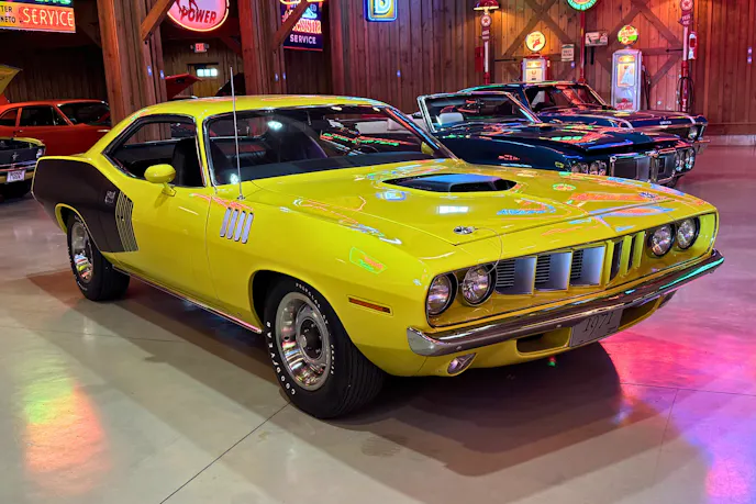 Acknowledged by many as the ‘King of all Muscle Cars,” the 1971 Hemicuda will probably never be dethroned. This was the final year of Street Hemi production, and in addition to the 426, this ’Cuda makes noise with the Curious Yellow/Billboard paint/stripe package. It features black high-back bucket seats that flank the awesome Hurst Pistol Grip shifter attached to the bulletproof 18-spline A833 four-speed transmission. All that Hemi goodness ends up at the Dana 60 rear spinning 4.10:1 cogs and rolling on 15×17 Rallye wheels and Goodyear Polyglas tires. It has a numbers-matching engine, along with a Shaker scoop popping through the hood. This Plymouth was sold new in British Columbia, Canada and built to Canadian specs. Furthermore, it was featured on the cover of Hot Rod magazine, along with coverage in other publications.
