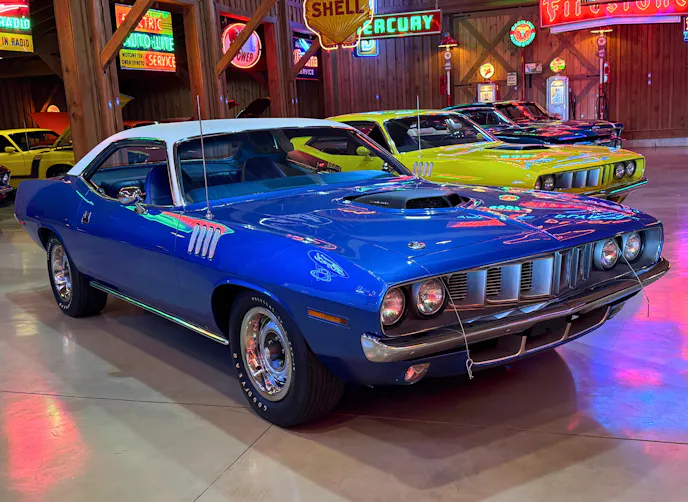 There’s hardly a vehicle on the planet that screams “muscle car” more than a Hemicuda. This is one-of-48 built in ’71 and shows only 21,500 miles. It’s painted in B5 “True Blue Metallic” and adorned with matching blue vinyl high-back bucket seats, dash, door panels, console, and steering column, which is ultra cool. This color combination looks stunning (note the lack of optional Billboard stripes) and is an unusual sight to see. Under that sinister black painted Shaker resides King Kong himself, the mighty 426 Hemi, sporting a pair of Carter AFB carburetors. This E-body was ordered with 727 TorqueFlite and has Chrysler’s Slap Stik automatic shifter. The Super Track Pak option was ordered, and that included the Dana 60 axle with 4.10:1 gear and Sure Grip diff, a 26-inch Max Cooling radiator, power brakes, and other items. It was completely restored and comes with a thorough vehicle inspection report from Mopar muscle car expert Dave Wise.