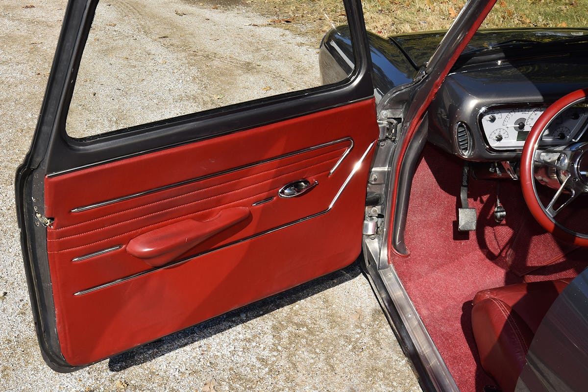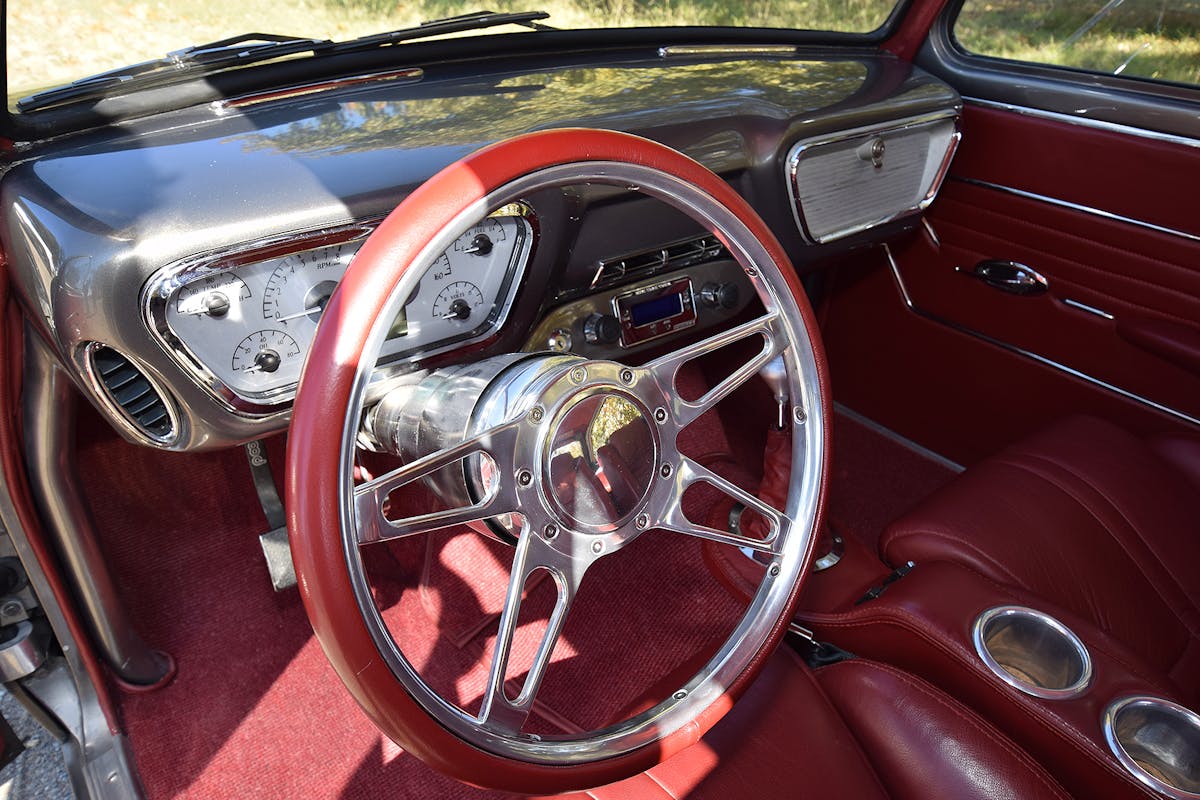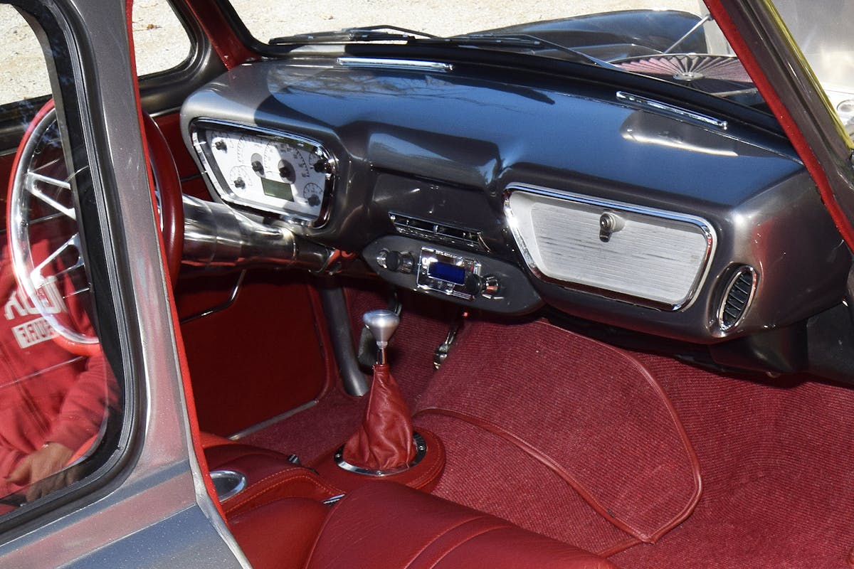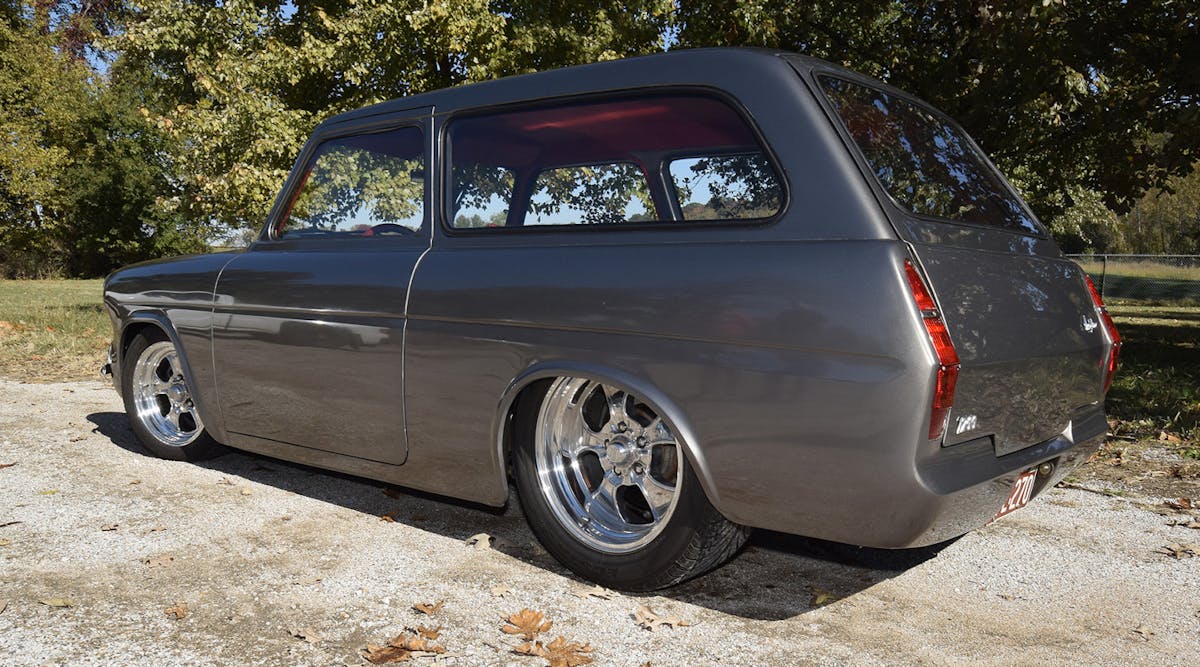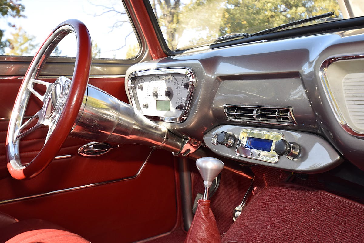 The seats are reupholstered from a 1985 Dodge Daytona. Oelklaus used a wealth of McMillan Rod and Custom stainless-steel molding throughout the interior and side panels. He custom shaped the moldings to mimic an Anglia Super saloon interior.