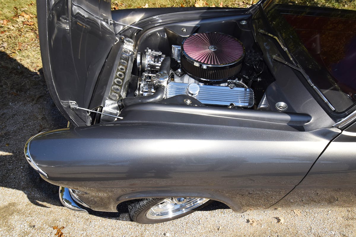 Another victim from his initial Gasser intent was the removal of the panel braces from under the hood. Paul outlines, “I used the second hood from the sedan to fabricate new bracing that doubles as a cowl induction hood from the underside.”