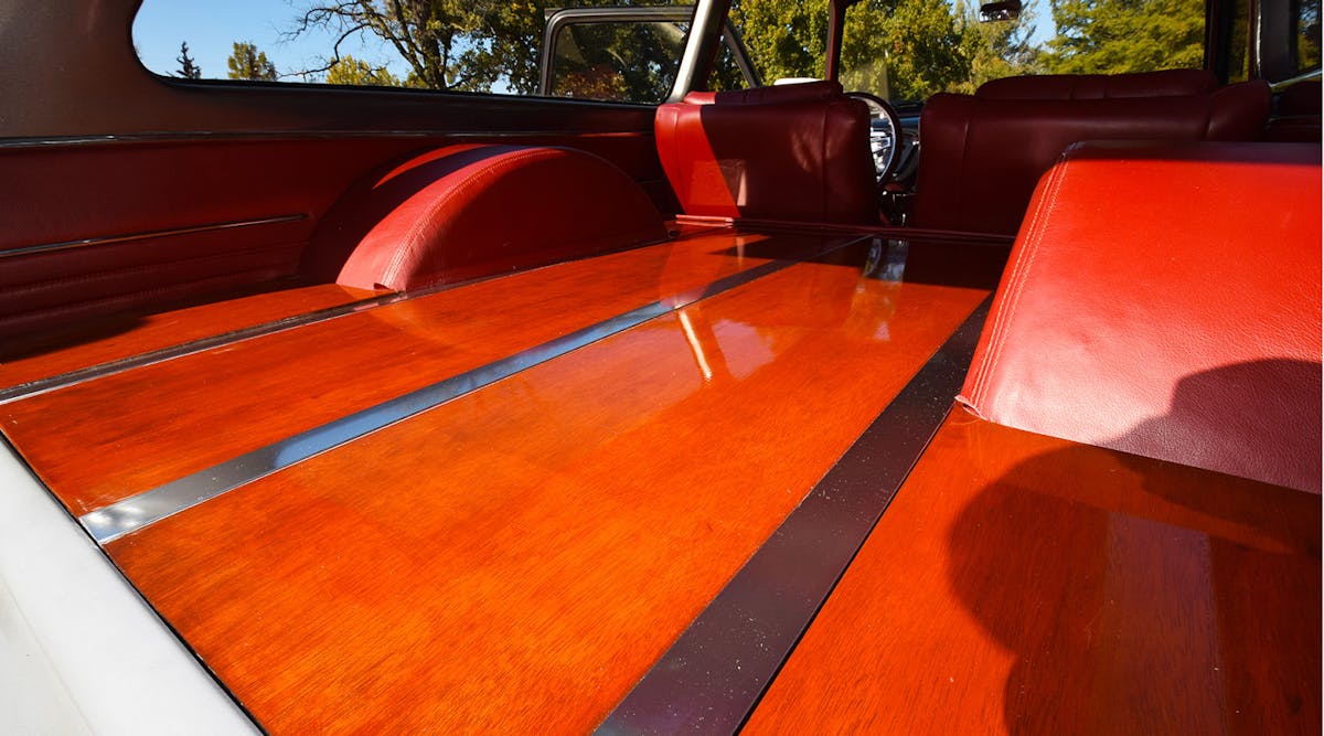 The body customizing list continues with the vent windows and the side window “C’ pillars removed. Oelklaus leaned the “B” pillar forward and shaved the door handles. All the lower door corners were radiused and the rear floor is covered with stylish stained mahogany wood and custom BedWood brand bed strips.