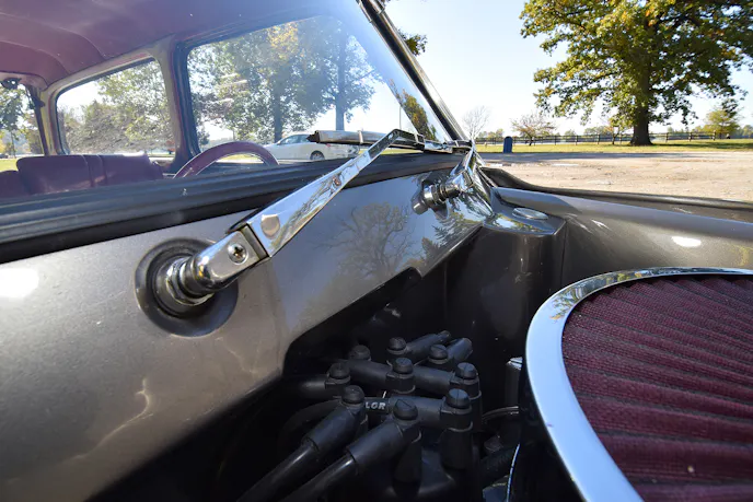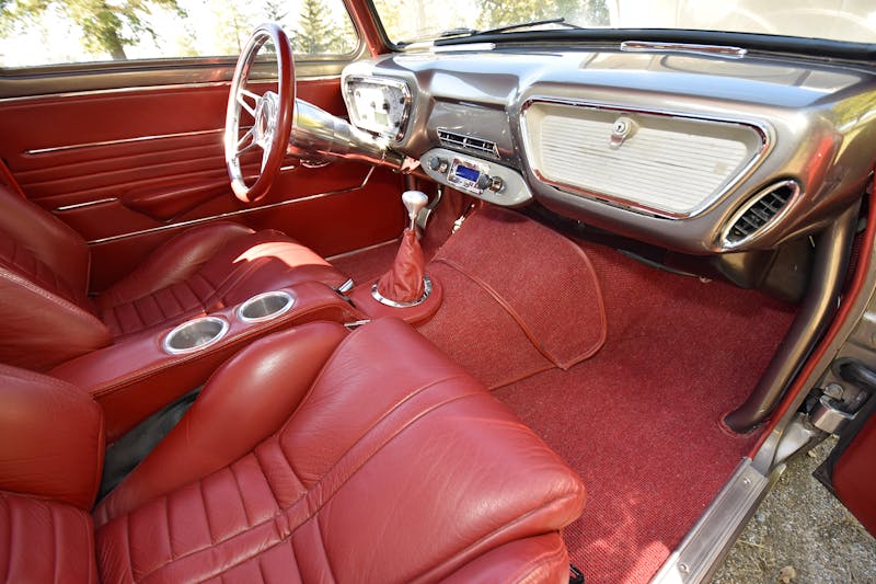 The seats are reupholstered from a 1985 Dodge Daytona. Oelklaus used a wealth of McMillan Rod and Custom stainless-steel molding throughout the interior and side panels. He custom shaped the moldings to mimic an Anglia Super saloon interior.