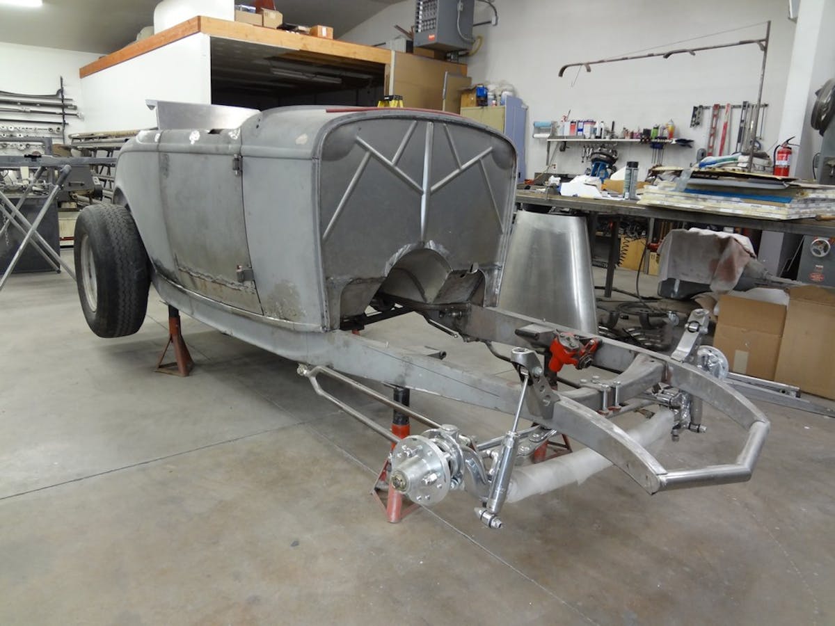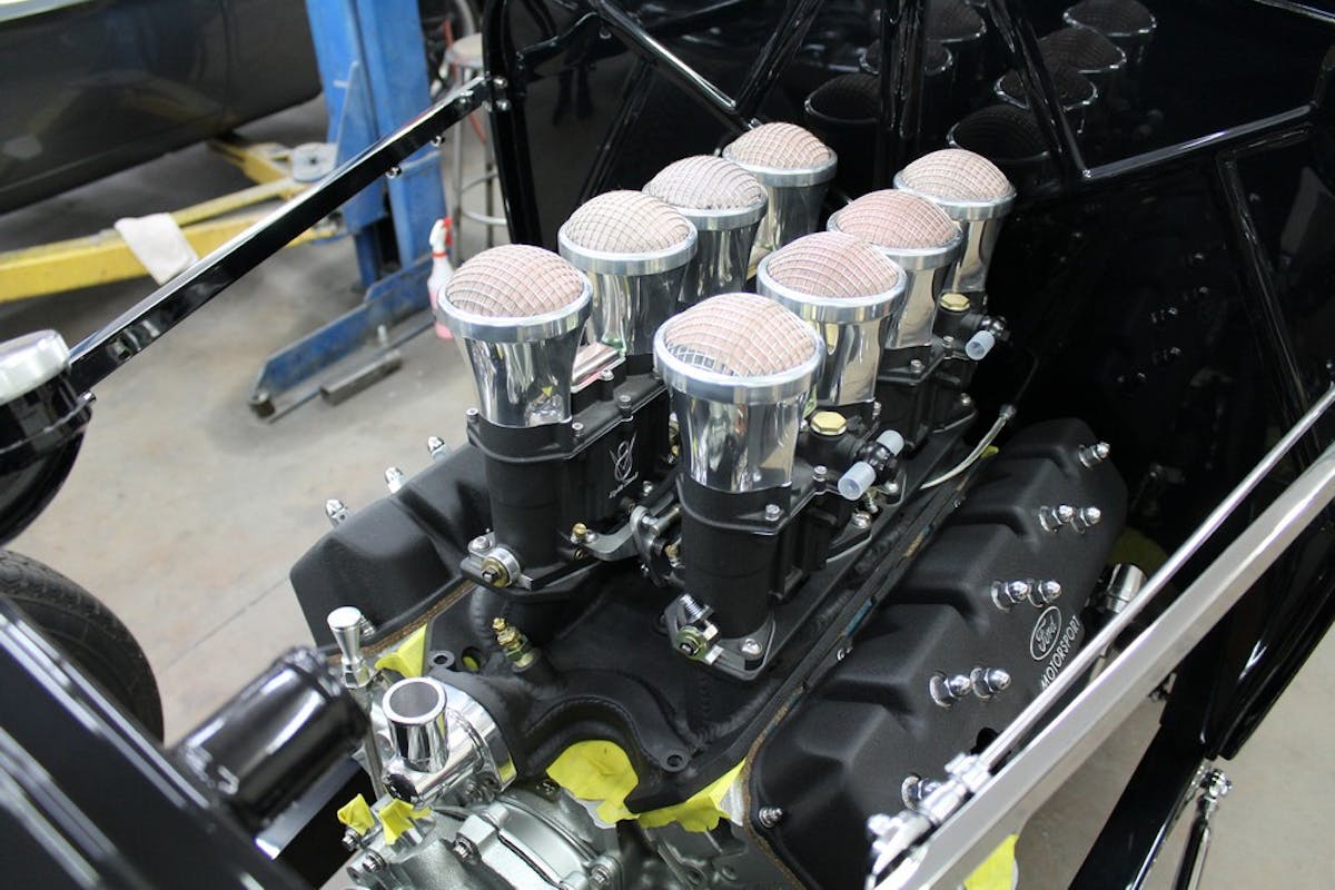 Backing the classic engine is a Ford automatic overdrive transmission, chosen for its driveability especially in California traffic, which pushes power to the pavement via a custom ASR driveshaft and the aforementioned Winters quick change rearend.