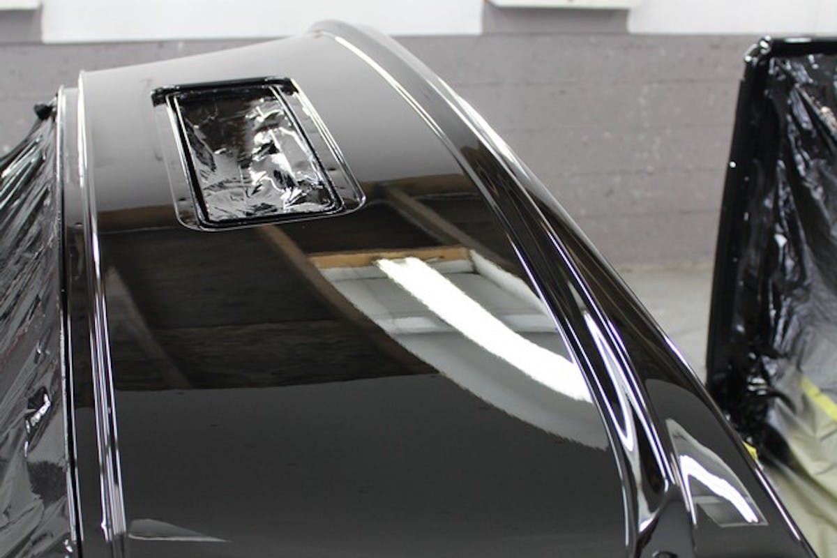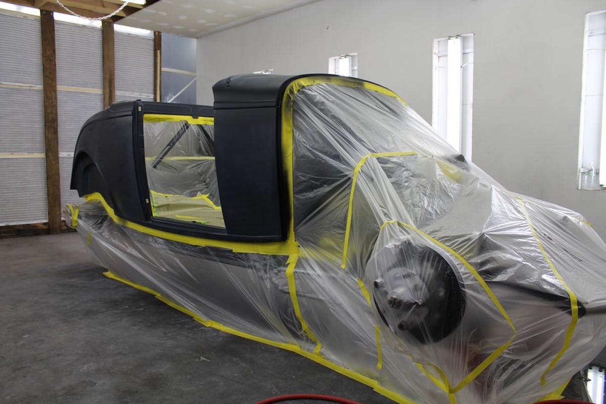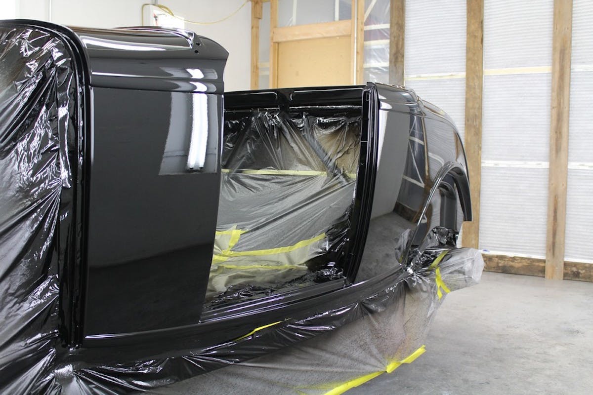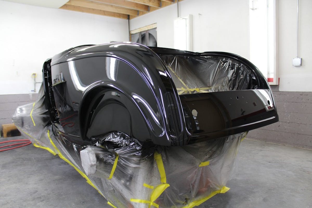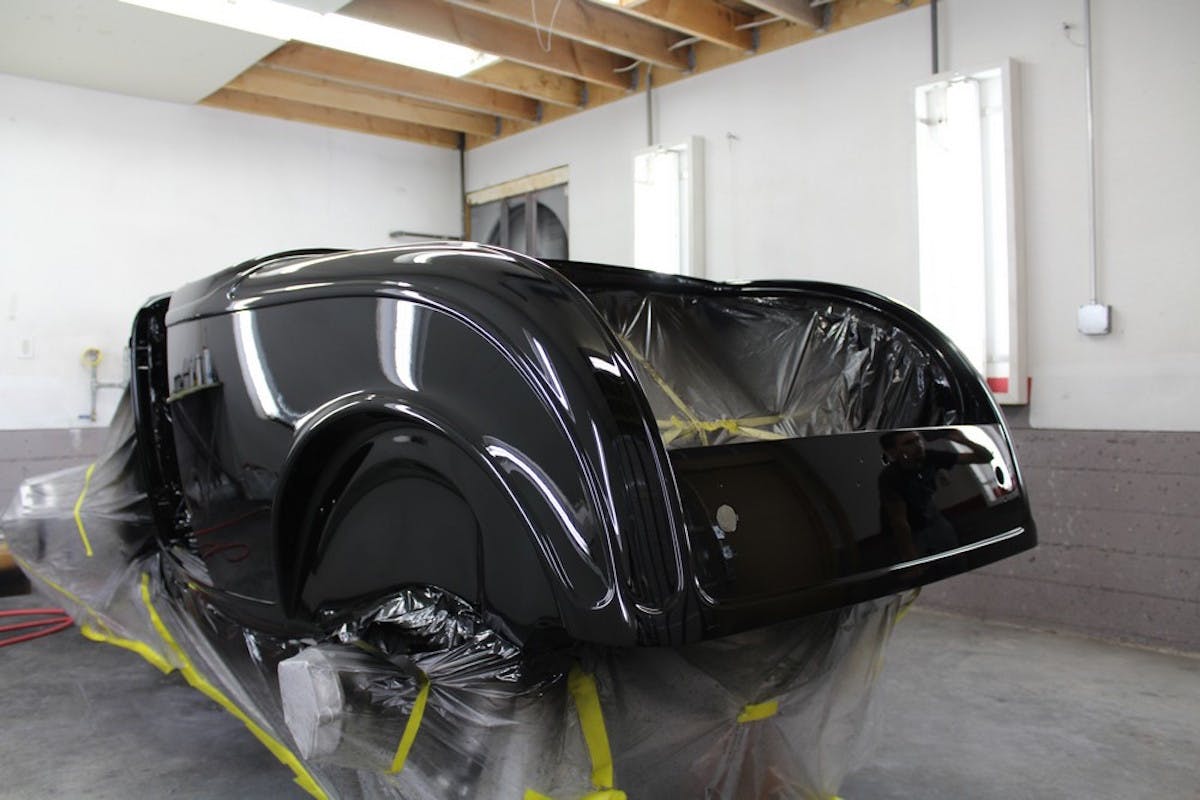 The rear body seams on the taillight panel were shaved, as were the seams on the package tray and door handles, adding to the roadster’s sleeker look. Topping off the formed and fitted roadster body is a hot rod staple — a flawless, mirror-like black paint scheme with an Axalta Chroma base laid by Brad Lovejoy, who also helped with the expertly executed bodywork on the car.