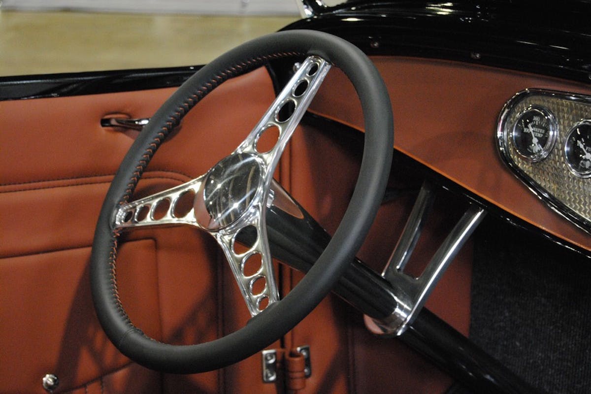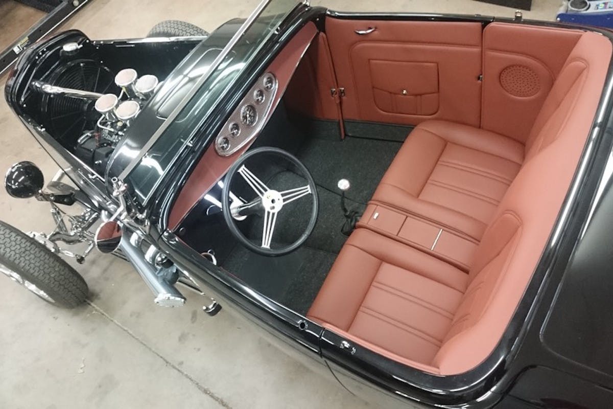 Inside, the interior of the car is a perfect mix of custom and classic designs thanks to Mike Miller. The custom bench has a built-in center console wrapped in chestnut-colored leather, which has been fitted with seat warmers. The dash, which is original to the Ford, is painted to match the upholstery and features Stewart Warner Wings gauges. The interior also features a full sound system with a built-in auxiliary port, 300-watt JL Audio amplifier and 6.5-inch Kicker speakers.