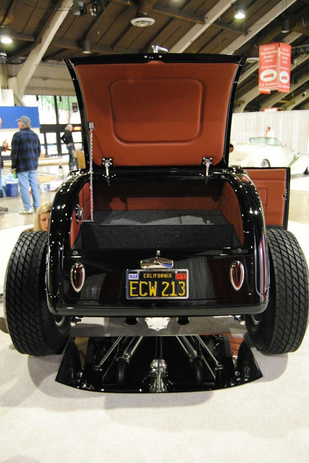 The rear body seams on the taillight panel were shaved, as were the seams on the package tray and door handles, adding to the roadster’s sleeker look. Topping off the formed and fitted roadster body is a hot rod staple — a flawless, mirror-like black paint scheme with an Axalta Chroma base laid by Brad Lovejoy, who also helped with the expertly executed bodywork on the car.