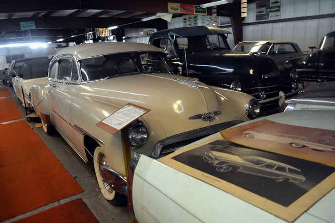 The museum is setup with some semblance of a once thriving hot spot, with carpet-lined walkways, mannequins dressed in period-correct clothing, vintage furniture, bicycles and license plates, and wooden stands with information on just about every vehicle on display. The warehouse now sits as an almost eerie reminder of what used to be. Almost every vehicle in the place, whether perfectly aligned with its neighbors in an organized row, or haphazardly pulled in through the overhead door and left as if parked after a run to the store 30 years ago and forgotten about, are covered in dust and sitting on at least one flat tire. Vehicles like a 1917 Laser kit car, a Syracuse fire truck, and Volkswagen Caddy are intermixed with both restored and untouched factory GM classics.