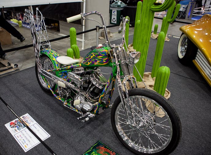 Show chrome is in no short supply on this Harley, and the generous use of it does an excellent job of complementing the greens, yellows, and purples the bike has been painted with.