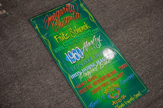 Fittingly, even the signboard for the custom Harley features more of Fritz’s handiwork with a paint gun, thanking his sponsors and detailing the build in a truly artful fashion.